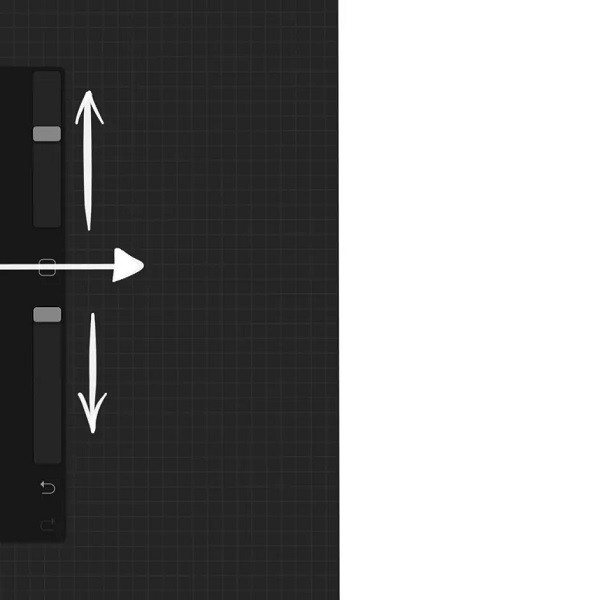 侧边栏可以快速调节当前所用画笔:上半部分的滑条调整当前画笔尺寸、下半部分改变画笔的透明度、中间的矩形默认可以用于打开取色器,你也可以在偏好设置中将其改为别的快捷按钮。侧边栏最下面的是撤销和重做按钮,按住撤销按钮会启用「快速撤销」——自动执行多次撤销操作。