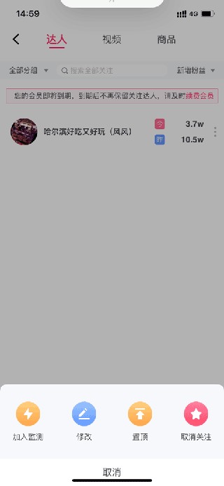 同样的方式,在在灰豚数据App首页,在关注列表里,点击更多,在竖的“…”可以取消关注。