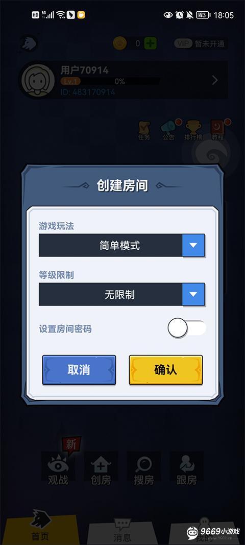 进入狼人杀游戏主界面,点击下方的建房,玩家们可以设置模式玩法以及等级限制和密码。