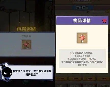 荣誉值需要打通关卡至110以上才能获得,是游戏中比较实用的资源之一。获得荣誉值后,可以在“达叔商店”购买所需资源(例如:黄金神装、达叔限定半价券、速通丸、金币等等)“达叔商店”每4小时/每天/每周一,都会更新一批商品,可以不定期去看一看有没有需要的东西~