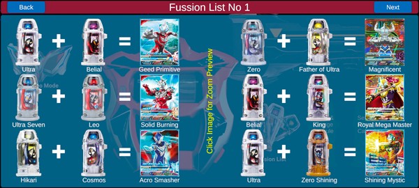 4、点击Fussion List,可以查看不同胶囊能合成什么奥特曼;