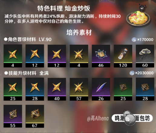 【灿金炒饭】:减少队伍中所有共鸣者24%纵跑、游泳耐力消耗,持续时间30分钟,在多人游戏中仅对自己的角色生效。