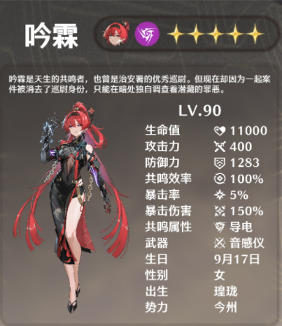 五星导电共鸣属性,LV.90生命值11000,攻击力400,防御力1283