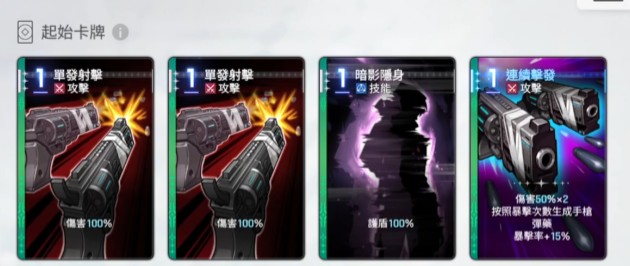路克的强大之处在于他自身的卡牌系统是有很多卡牌区分能力的,他在自身的初始卡组当中组合就比较独特,这里他上场自身带的卡牌有包括两张造成100%伤害的普通攻击卡,以及一张消耗1点能量的技能暗影隐身,这个卡带的技能可以为路克附加足够的护盾,利用这样的一张专属卡路克也可以带来多次的连续打击效果,而在这里进行每次攻击的时候都可以造成50数值的%伤害,并能在暴击时生成手枪弹药,同时提高15%暴击率生成效果,所以路克在后期自身有足够的卡组加成的情况下也是会有更多爆发潜力的。